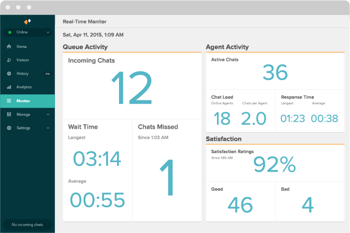 View real-time data on chat volume, visitor experience, and agent performance at a glance.