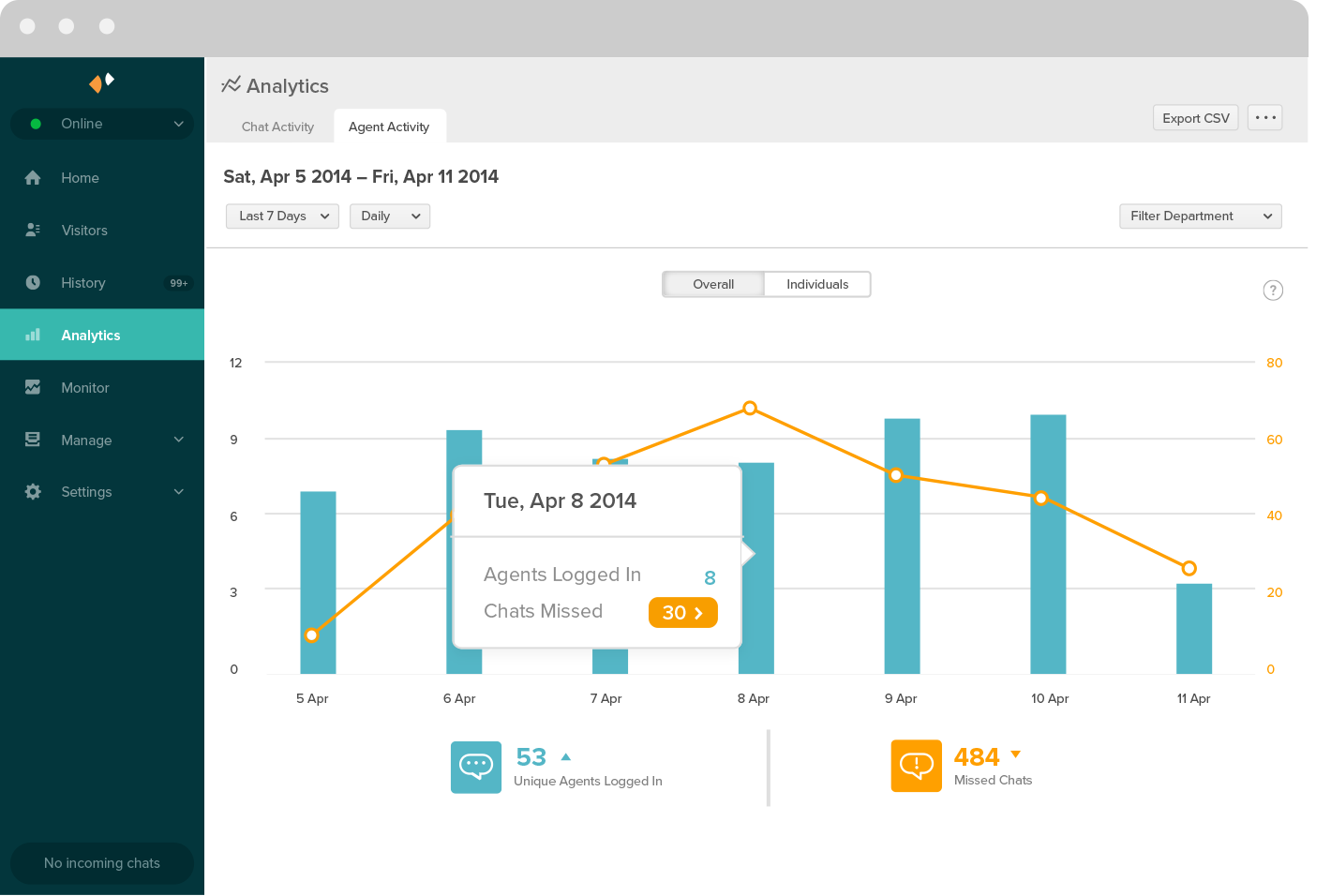 Track broader and specific agent metrics such as time logged in, chats served, response time, and satisfaction ratings.